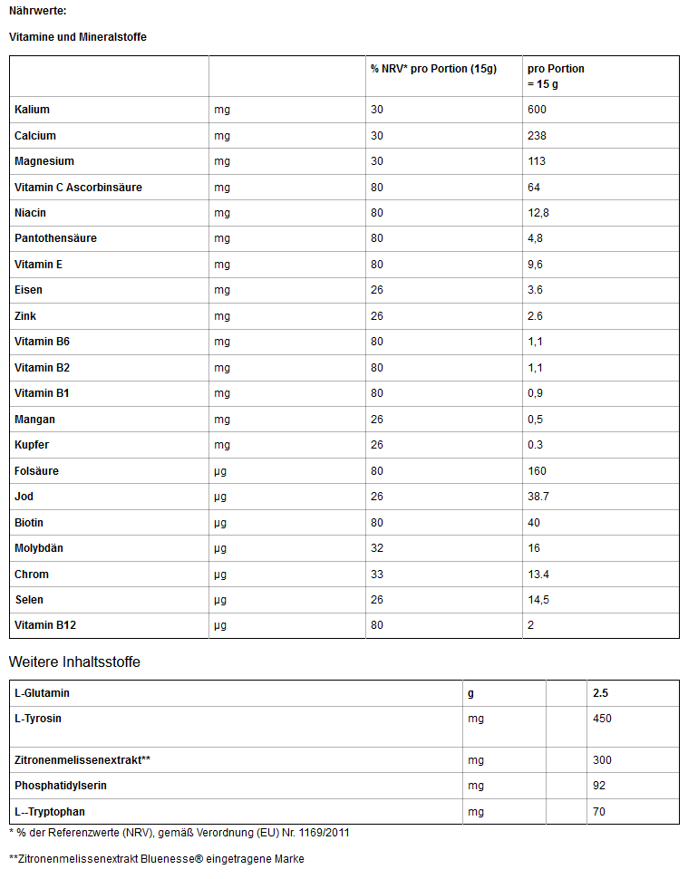 Maltodextrin, L-Glutamin, Kaliumcitrat, Säuerungsmittel Citronensäure, Calciumcarbonat, Magnesiumcarbonat, L-Tyrosin, L-Cystein-Hydrochlorid, Betain-Hydrochlorid, Farbstoff: Betanin, Aroma, Zitronenmelissen-Blattextrakt, Cholin—Bitartrat, Soja-Phosphatidylserin, Tryptophan-Pulver(L-Tryptophan, Emulgator:Lecithine (Sonnenblume)), L-Ascorbinsäure, Süßungsmittel Sucralose, DL-alpha-Tocopherylacetat, Nicotinamid; Eisensulfat, Zinksulfat, Calcium-D-Pantothenat, Chromchlorid, Mangangluconat, Natriummolybdat, Cyanocobalamin, Kupfergluconat, Pyridoxinhydrochlorid, Riboflavin, Thiaminmononitrat, Pteroylmonoglutaminsäure, Kaliumiodat, D-Biotin, Natriumselenit.